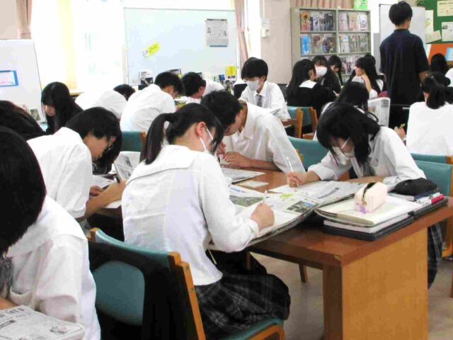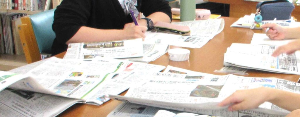 新聞記事から、興味あるトピックを見つける!~政治・経済探究授業~ 2025.10.9 図書館 普段はあまり手にしないかもしれない「新聞」。社会の動きだけでなく、その背景も知ることができる、重要な情報源です。 「朝日新聞」「中日新聞」「毎日新聞」「読売新聞」「伊勢新聞」を所蔵。比較するのも興味深い!