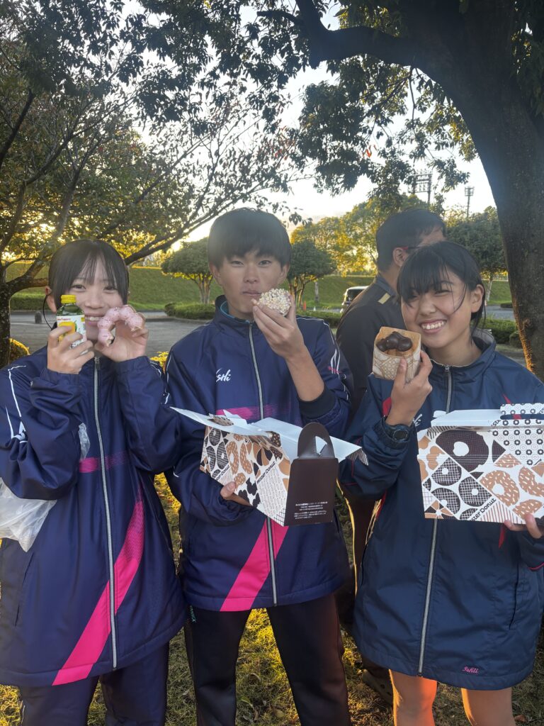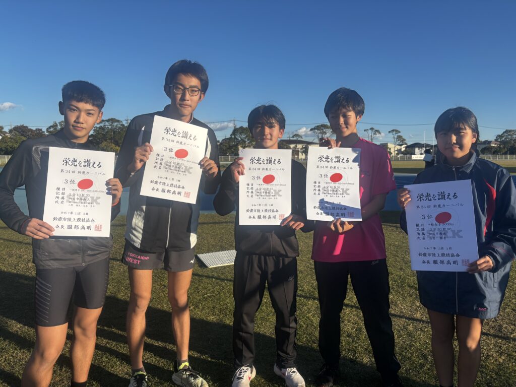 鈴鹿カーニバル 11.3 2025.11.3 陸上部 鈴鹿陸上競技場で今季ラストの大会、鈴鹿カーニバルに参加しました。 ▼スウェーデンリレーは1年チームと2年チームで負けられない戦いをしていたようです 目標に向かって4月から頑張ってきた成果がしっかりと出せた大会になりました。 ▼3位入賞🥉(スウェ―デン:100m+200m+300m+400mリレー、3000m) ▼全員揃って📸 ここから春の大会に向けて冬季練習がはじまります!全員で盛り上げながら頑張りましょう! ▼帰りに差し入れをいただいてモグモグ🍩 支えてくださる全てのことに感謝!