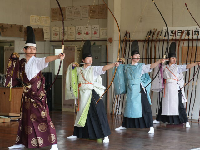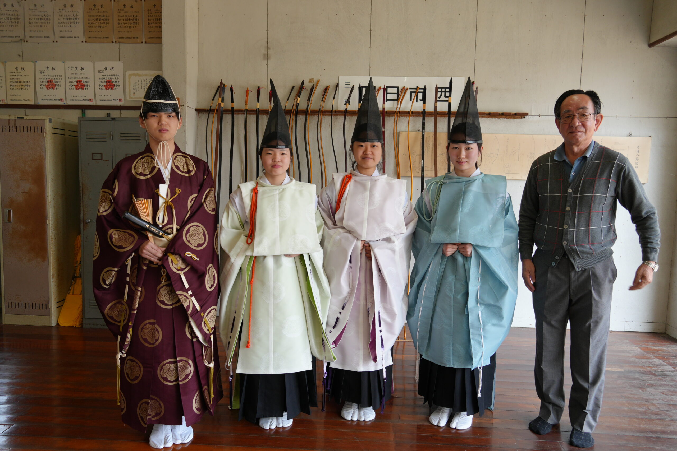 四日市西高校弓道部では、指導に来てくださっている外部指導者の先生のご厚意で、毎年春休みに新3年生が昔の衣装を着て弓を引かせていただいています。